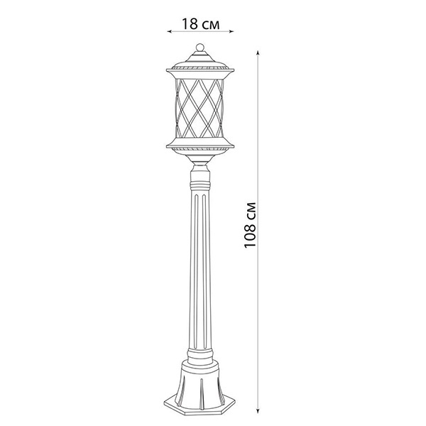 Описание: Конструкция сборно-разборная. Состоит из двух основных элементов – фонаря и столба. Форма фонаря – цилиндр. Сечение столба – круг. В основании столба находится шестигранная опорная платформа с отверстиями для анкерного крепежа. Плафон фонаря – рифленое кварцевое стекло.