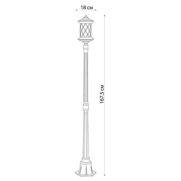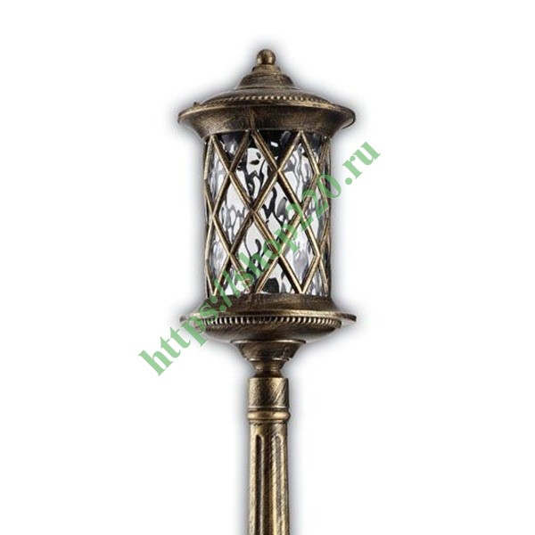 Описание: Сборно-разборная конструкция состоит из двух основных элементов – фонаря и опоры. Арматура фонаря – сетчатая, в форме цилиндра. Сечение столба – круг. Основание светильника – шестигранная установочная платформа с отверстиями для элементов крепежа. Плафон – стеклянный, рифленый. Цвет – черное золото.