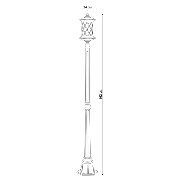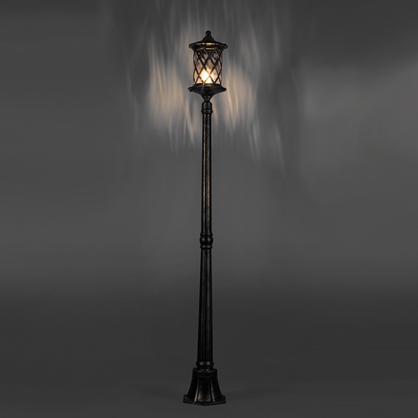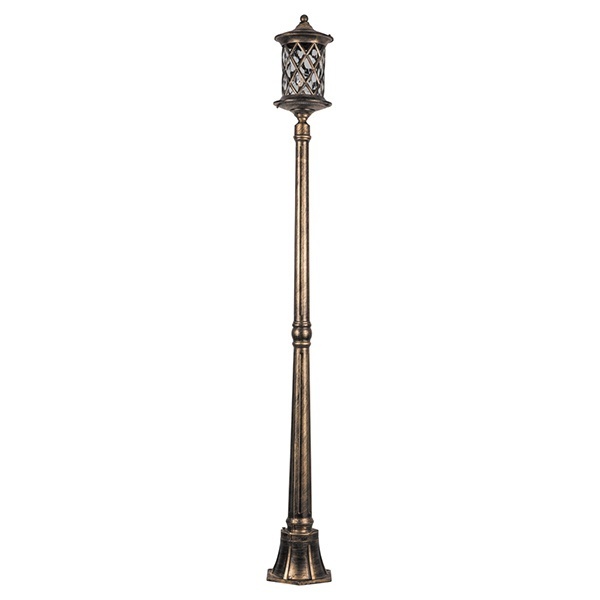 Изготавливается из стойкого к неблагоприятным погодным условиям силумина и имеет степень защиты, относящуюся к классу IP44. Светильник устанавливается на столбе и имеет общую высоту 1.62 мм. Фонарь круглой формы диаметром 240 мм. Дизайн выполнен в готическом стиле из силумина. Светильник окрашен в темный цвет под черное золото.