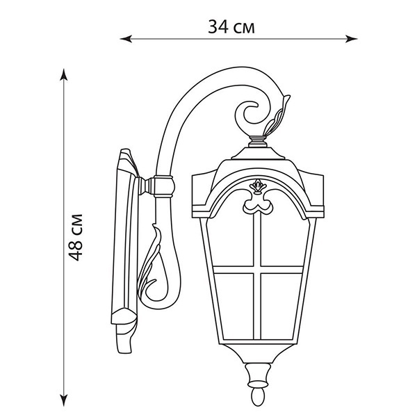 Фонарь жестко подвешивается сверху вниз на специальную, выгнутую дугой консоль, закрепленную к стене строения либо иной плоской поверхности. Корпус светильника литой, четырехгранный, изготовлен из силумина с имитацией готического стиля, имеет квадратное сечение 230х230 мм и обеспечен защитой от пыли и влаги системой класса IP44. Длина фонаря составляет 340 мм.
