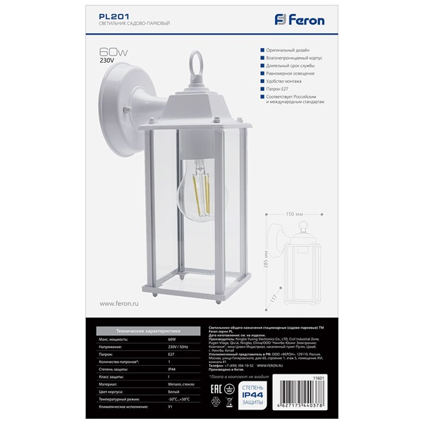 Классический четырехгранный светильник настенного исполнения торговой марки Ферон, Высококачественный алюминиевый корпус с порошковым окрашиванием в белый цвет сохранит первозданный вид на долгое время. Источником питания для светильника является электрическая сеть переменного тока с напряжением 230 Вольт, а цоколь Е27 позволяет использовать разного типа лампы будь то накаливания, светодиодные, либо энергосберегающая мощностью до 60 Ватт. Осветительный прибор изменит образ вашего загородного дома, веранды, беседки и даже гостиной будет законченным: благородным и романтичным. Габариты светильника составляет 150*117*285 мм