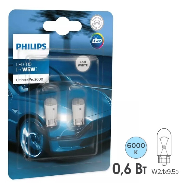Для соблюдения безопасности на дороге крайне важно сообщать о своих намерениях другим участникам движения. Качественные сигнальные огни особенно важны в условиях плохой видимости. Известная на мировом рынке компания-производитель Philips предлагает линейку сигнальных автоламп Ultinon Pro3000, которые представляют собой светодиодные огни, обеспечивающие яркий дневной свет с цветовой температурой 6000 Кельвинов, гарантируя улучшенное равномерное освещение. Комплект из 2 единиц относится к типу ламп W5W с цоколем W2.1x9.5d и применяется в габаритных огнях или для подсветки салона, багажника или бортовой панели. Изделия рассчитаны на напряжение 12 Вольт и обладают мощностью 0.6 Ватт. Они излучают белый световой поток величиной 55 Люменов, который придает стильный внешний вид автомобилю. Широкий угол луча обеспечивает отличную видимость, а другие участники движения быстрее и легче замечают ваш автотранспорт. Лампы отличаются простым подключением. Они имеют высокую производительность, эффективны, надежны и обладают долгим сроком службы до 3000 часов. Изделия упакованы в фирменный блистер.