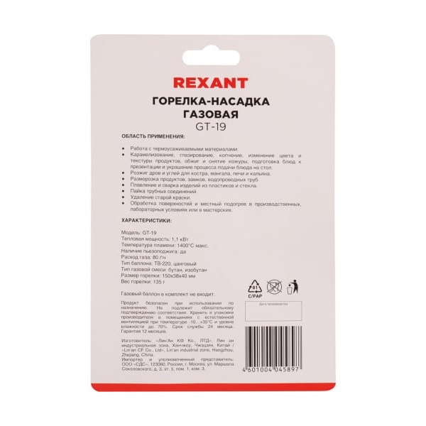 Газовая горелка-насадка создана компанией "REXANT", которая специализируется на недорогой и качественной продукции.