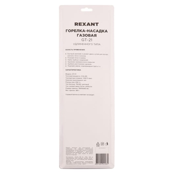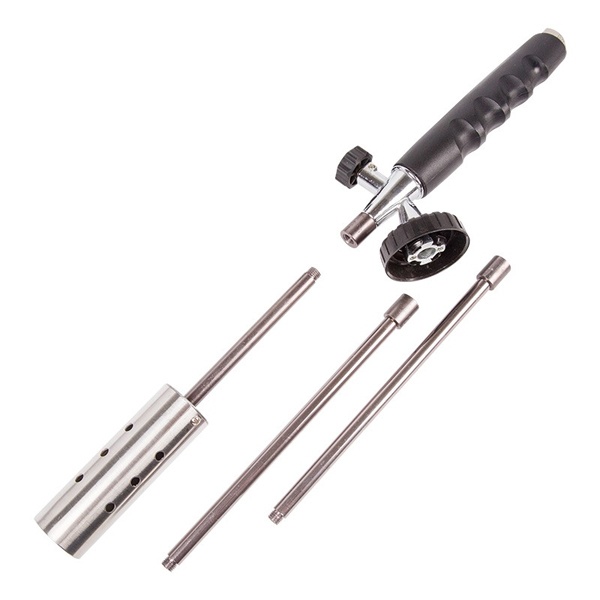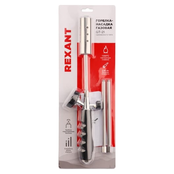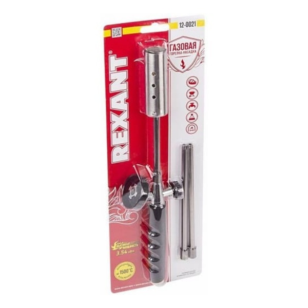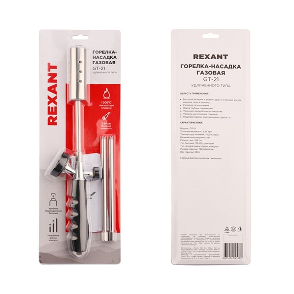 Газовая горелка-насадка создана компанией "REXANT", которая специализируется на недорогой и качественной продукции.Горелка-насадка имеет широкое сопло и является хорошим примером недорогой и надежной газовой горелки-насадки. Из-за своей цены очень хорошо подойдет обычным пользователям, которые первый раз приобретают горелку.Длинная удлинительной трубки бывает трех видов 395 мм, 590 мм и 785 мм и отлично подойдет если вы не дотягиваетесь обычной горелкой-насадкой, так же имеет повышенную мощность.Газовая горелка-насадка от компании "REXANT" без проблем справится с такими видами работ как: плавка пластика или стекла; снятие любых видов красочных изделий; разморозит дверной замок на даче; закоптит нужный вам продукт или карамелизирует сладкое; разморозит продукты; эффективно, а главное экологично подожжет дрова или угли.Сопло имеет диаметр 32 мм, что придаст в свою очередь огню широкую форму. Требуется 90 секунд для полного разогрева горелки, кажется много, но вы даже не заметите, как уже будете ею пользоваться. Мощность 3,54 кВт/3,052 ккал. Температура выходного пламени максимум 1500 С, вполне достаточно, чтобы выполняло свои функции. Расход газа при нормальной работе 258 г/час. Тип газового баллона: ТВ-220 (цанговый). Баллон нужно заправлять смесью газа бутан/изобутан. Горелка поджигается не автоматически, поэтому не забывайте носить с собой средство поджога. Изготовлена из высококачественного материала: медь + алюминий + сталь + сплав цинка + пластик. Имеет средний размер: 390х50х90 мм и при этом весит всего 356 г.