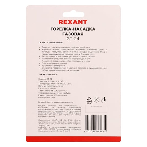 Газовая горелка-насадка создана компанией "REXANT", которая специализируется на недорогой и качественной продукции.