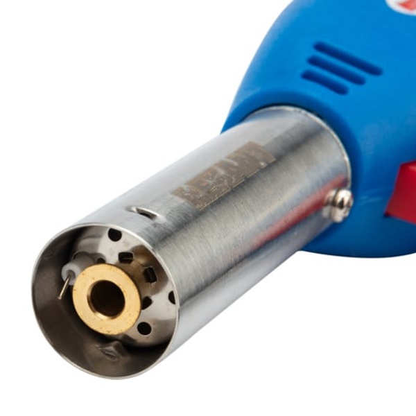 Сопло имеет диаметр 20 мм, что придаст в свою очередь огню широкую форму. Требуется 90 секунд для полного разогрева горелки, кажется много, но вы даже не заметите, как уже будете ею пользоваться. Мощность 1,1 кВт/0,946 ккал. Температура выходного пламени максимум 1400 С, вполне достаточно, чтобы выполняло свои функции. Расход газа при нормальной работе 80 г/час. Тип газового баллона: ТВ-220 (цанговый). Баллон нужно заправлять смесью газа бутан/изобутан. Горелка поджигается автоматически, поэтому вам не нужно носить с собой средство для поджога. Изготовлена из высококачественного материала: медь + нержавеющая сталь + алюминий + сплав цинка + пластик. Имеет небольшой размер: 170х55х65 мм и при этом весит всего 142 г.