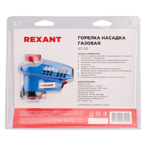Газовая горелка-насадка создана компанией "REXANT", которая специализируется на недорогой и качественной продукции.