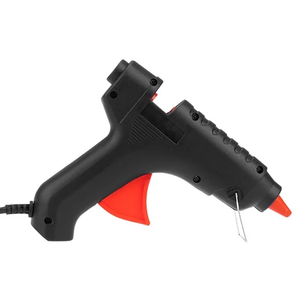 Корпус пистолета выполнен из ударопрочного пластика, что увеличивает его срок службы, а металлическая скоба позволяет удобно фиксировать пистолет в режиме ожидания. Сопло защищено специальным клапаном, предотвращающим случайное вытекание клея, а термостойкий силиконовый протектор снижает риск ожогов при случайном контакте и защищает рабочую зону от перегрева. Пистолет работает с клеевыми стержнями диаметром 11 мм.