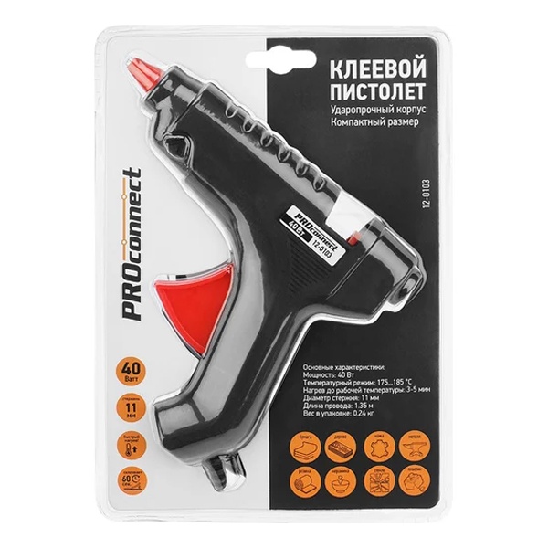 Пистолет клеевой мощностью 40 Ватт, для стержней дтаметром 11 мм, с выключателем 12-0103