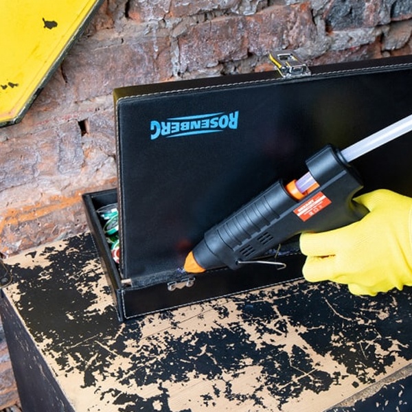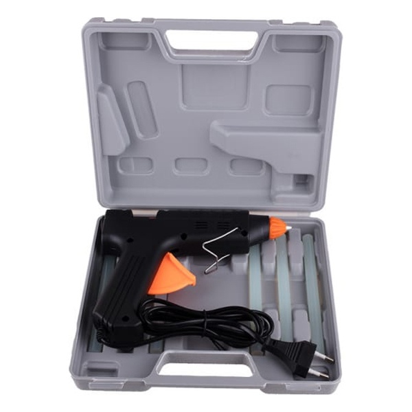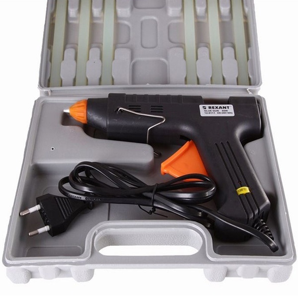 Для безопасного хранения, бережной транспортировки и защиты от загрязнений предусмотрен пластмассовый кейс, в котором есть запас клеевых стержней (6 шт.). Максимальная длина клеевого стержня в кейсе составляет не более 20 см.