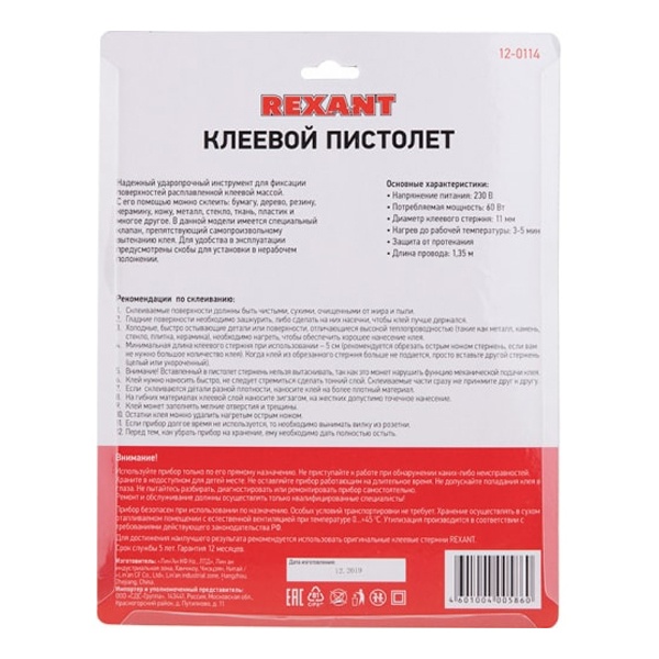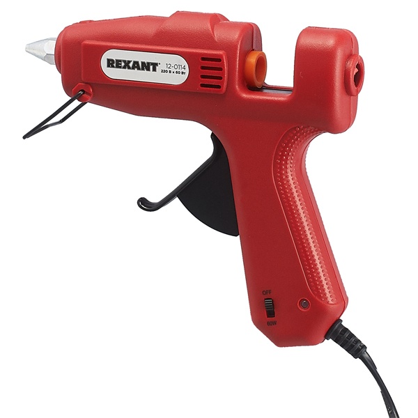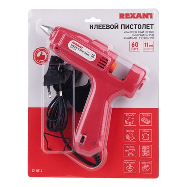 Пистолет клеевой 60 Вт (Профи) REXANT предназначен для прочной фиксации поверхностей с помощью расплавленной клеевой массы. В этой модели предусмотрен специальный клапан, который препятствует самопроизвольному вытеканию клея. Заправляется он специальным клеевым стержнем диаметром 11 мм. Корпус клеевого пистолета изготовлен из ударопрочной пластмассы и имеет скобу для надежной установки в нерабочем положении. Благодаря индикации на корпусе пистолета (LED лампочки красного и зеленого цветов) удобно определить, включен ли пистолет и когда будет достигнута оптимальная для работы температура.Принцип работы: клеевой стержень плавится в металлической камере с помощью нагревательного устройства и для точного дозирования при нажатии на курок подается из сопла на склеиваемую поверхность. С его помощью вы сможете склеить: дерево, пластик, резину, кожу, стекло, металлы (их лучше перед работой разогревать феном), ткань, пенопласт, керамику, картон, бумагу, цветы или что-то другое.Используется как в домашних условиях, так и на производстве: для монтажа электрических плат, декорирования, изготовления упаковочной и сувенирной продукции, при прокладке кабеля сетей фиксированной телефонной связи и сетей передачи данных, при производстве багетов и картинных рам.