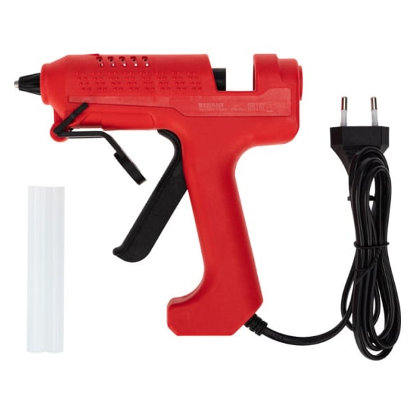 Принцип работы: клеевой стержень плавится в металлической камере с помощью нагревательного устройства и для точного дозирования при нажатии на курок подается из сопла на склеиваемую поверхность. Высокая мощность пистолета позволяет очень быстро разогреть клеевой стержень и получать удовольствие от быстрой и бесперебойной работы. С его помощью вы сможете склеить: дерево, пластик, резину, кожу, стекло, металлы (их лучше перед работой разогревать феном), ткань, пенопласт, керамику, картон, бумагу, цветы или что-то другое.