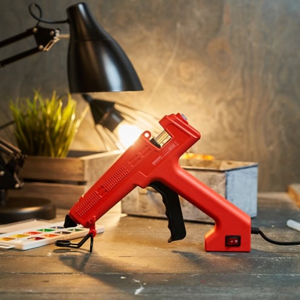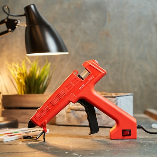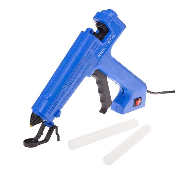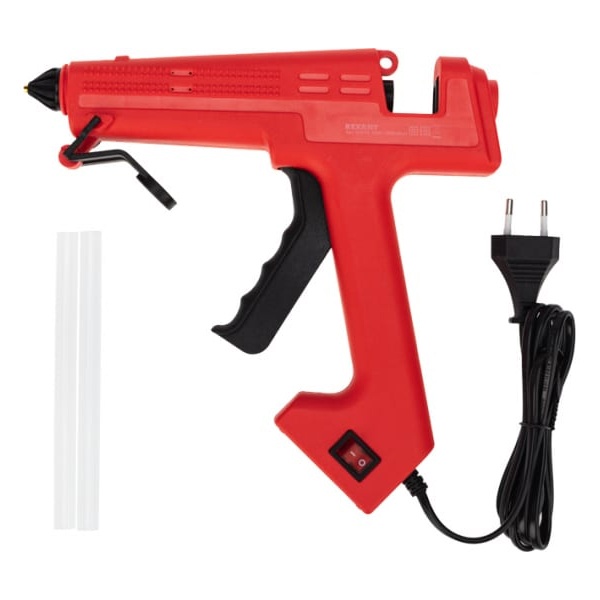 Принцип работы: клеевой стержень плавится в металлической камере с помощью нагревательного устройства и для точного дозирования при нажатии на курок подается из сопла на склеиваемую поверхность. Высокая мощность пистолета позволяет очень быстро разогреть клеевой стержень и получать удовольствие от быстрой и бесперебойной работы. С его помощью вы сможете склеить: дерево, пластик, резину, кожу, стекло, металлы (их лучше перед работой разогревать феном), ткань, пенопласт, керамику, картон, бумагу, цветы или что-то другое.