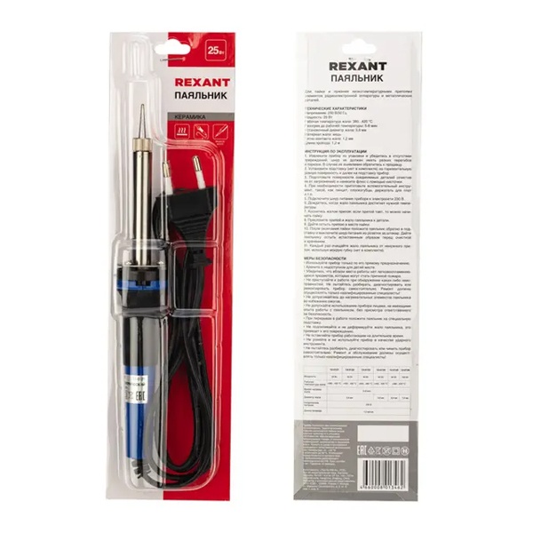 Паяльник с керамическим нагревателем, долговечное жало 25 Вт REXANT предназначен для ручного монтажа радиоэлементов. Его можно использовать как в домашних условиях, так и в профессиональных лабораториях.Паяльник выполнен с керамическим нагревательным элементом, поэтому нагревается быстрее чем, нихромовый и при бережном отношении прослужит много лет. Долговечное жало паяльника состоит из медного сердечника, покрытого слоем электролитически осажденного железа. Рабочая часть жала электрохимически покрыта слоем олова (что обеспечивает облуживаемость), а остальная поверхность — хромирована.Такие жала могут при соблюдении ряда предосторожностей работать длительное время без разрушения.