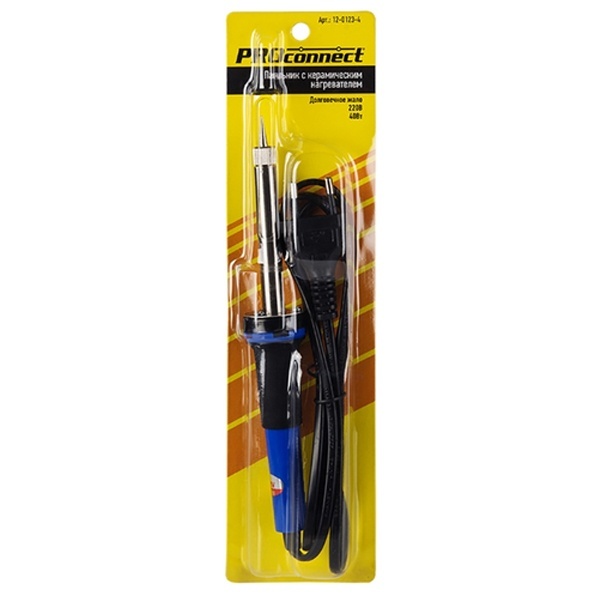Паяльник, долговечное жало 40 Вт PROconnect предназначен для ручного монтажа радиоэлементов. Его можно использовать как в домашних условиях, так и в профессиональных лабораториях. Долговечное жало паяльника состоит из медного сердечника, покрытого слоем электролитически осажденного железа. Рабочая часть жала электрохимически покрыта слоем олова (что обеспечивает облуживаемость), а остальная поверхность — хромирована. Такие жала могут при соблюдении ряда предосторожностей работать длительное время без разрушения.