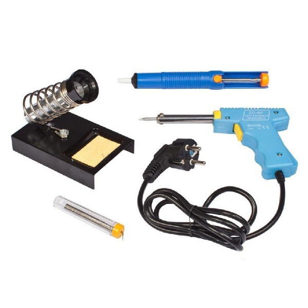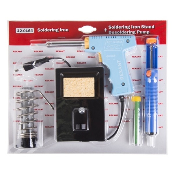Набор для пайки №5 Rexant — готовое решение для выполнения паяльных работ в электромонтаже, радиолюбительских проектах и мелком ремонте. В комплект входят наиболее востребованные инструменты для пайки и демонтажа припоя: импульсный паяльник 30/70 Вт, оловоотсос, подставка и припой. Набор помогает быстро приступить к работе без подбора отдельных аксессуаров.