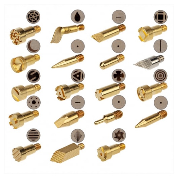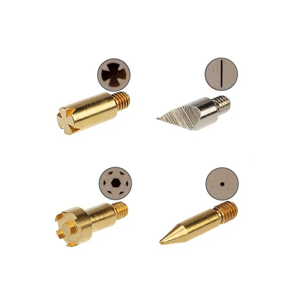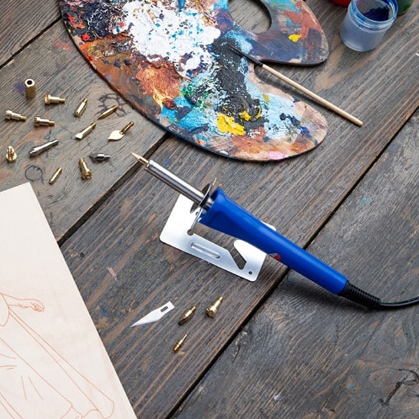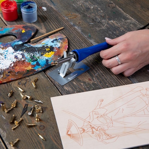 С помощью этих насадок можно создавать красивые картины, выжигая на дереве различные узоры, выполнять выжигание на коже или резать пластмассу. Все насадки закрепляются с помощью винта. Для удобства пользования и транспортировки набор поставляется в пластиковом боксе.