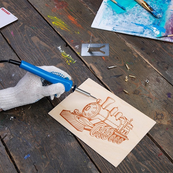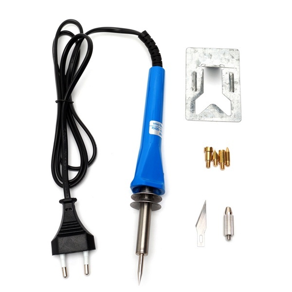 Благодаря 6 различным насадкам его можно сделать как паяльником, так и выжигателем. С помощью этих насадок можно создавать красивые картины, выжигая на дереве различные узоры, выполнять выжигание на коже или резать пластмассу.Все насадки закрепляются с помощью винта.