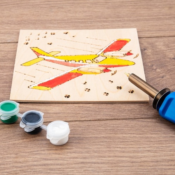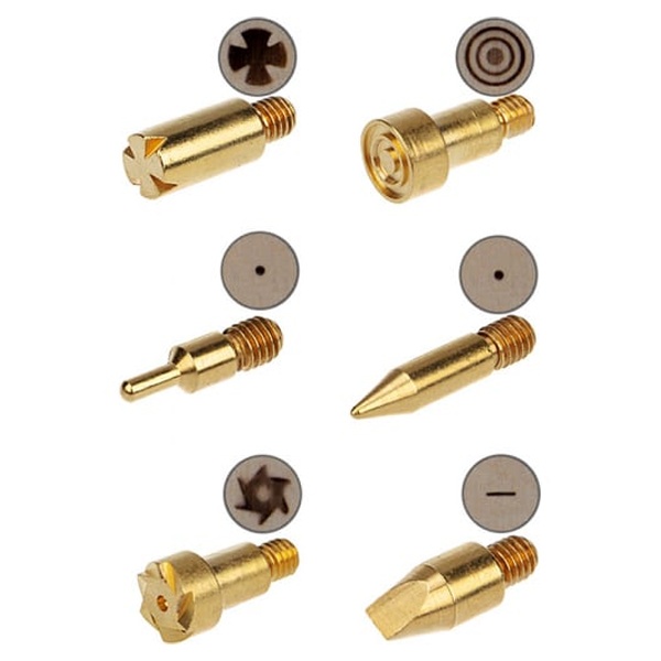 Благодаря 6 различным насадкам его можно сделать как паяльником, так и выжигателем. С помощью этих насадок можно создавать красивые картины, выжигая на дереве различные узоры, выполнять выжигание на коже или резать пластмассу. Все насадки закрепляются с помощью винта.