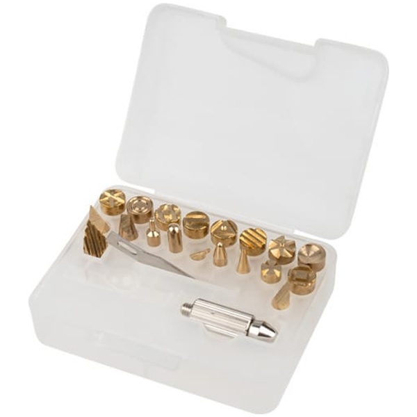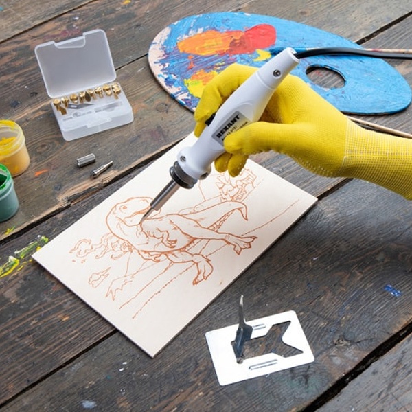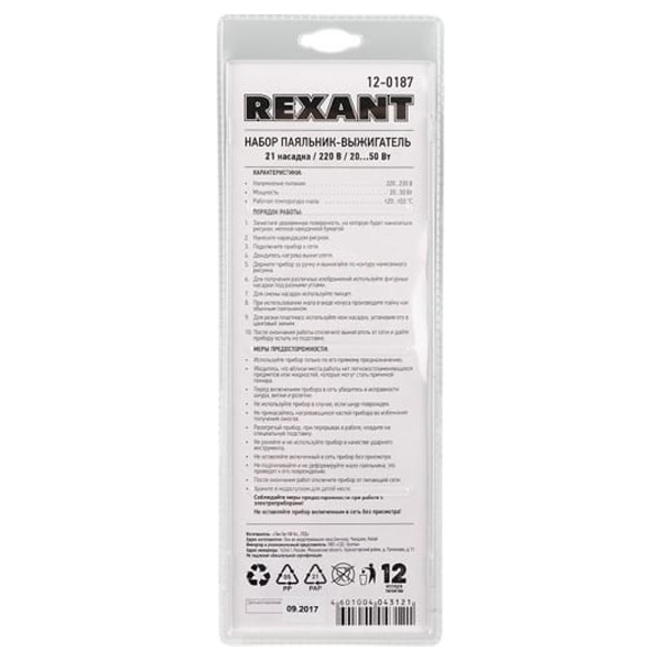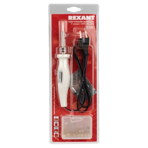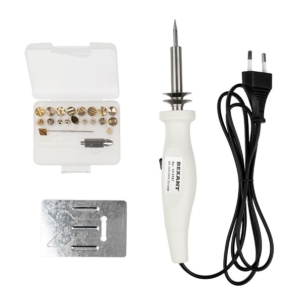 Набор паяльник-выжигатель (22 насадки) 220 V 20/50 Вт REXANT - отличное решение для тех, кто стремится по максимуму использовать полезные приборы. Суть работы паяльников и выжигателей по дереву очень схожа, на этом и основано действие прибора. Благодаря различным насадкам его можно сделать как паяльником, так и выжигателем. С помощью этих насадок можно создавать красивые картины, выжигая на дереве различные узоры, выполнять выжигание на коже или резать пластмассу. Все насадки закрепляются с помощью винта. Прибор очень экономичен, потребляемая мощность инструмента 20/50 Вт.