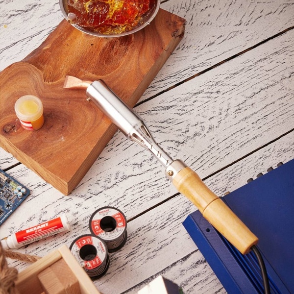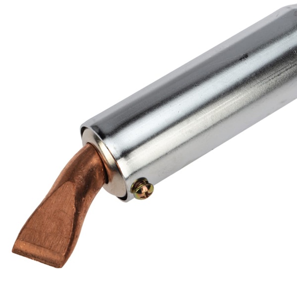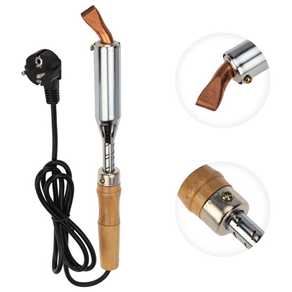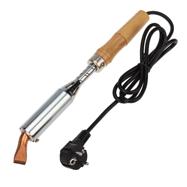 Электрический паяльник ПД 200 Вт с деревянной ручкой и клинообразным жалом непрерывного нагрева предназначен для монтажной пайки и лужения оловянно-свинцовистыми припоями элементов радиоэлектронной аппаратуры и тонкостенных металлических изделий в производственных и бытовых условиях.Перед началом эксплуатации электрического паяльника паяльное жало следует подвергнуть лужению.