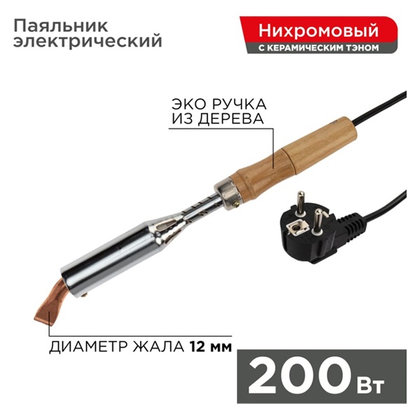 Паяльник ПД REXANT, керам.нагреватель, 200 Вт, 230 В, деревянная ручка