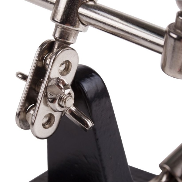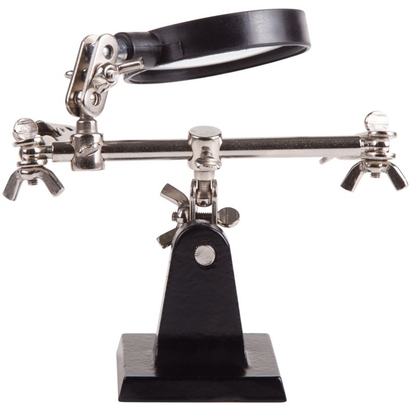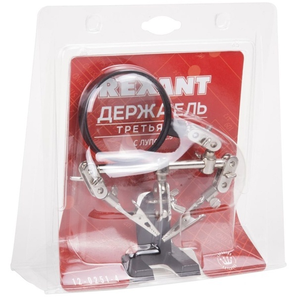 Штатив для пайки «третья рука» торговой марки Rexant с лупой х2,5 кратным увеличением используется при пайке и сборке мелких изделий в электронике или в ювелирном деле, когда не хватает двух рук. Он имеет устойчивое основание, изготовленное из чугуна. На основании закреплена трубка с 2 зажимами типа «крокодил» и увеличительным стеклом. Все приспособления подвижны во всех плоскостях для удобной работы. Зажимы имеют никелевое антикоррозийное покрытие. Лупа диаметром 60 мм изготовлена из стекла и обладает 2,5 кратным увеличением. Приспособления многофункциональны и предназначены для выполнения задач повышенной сложности. Размер товара без упаковки в раскрытом виде: 268x200x55 мм. Срок службы изделия: 5 лет. Гарантия: 12 месяцев. Хранить изделие необходимо в сухом отапливаемом помещении при температуре от 0 до 45 градусов Цельсия.