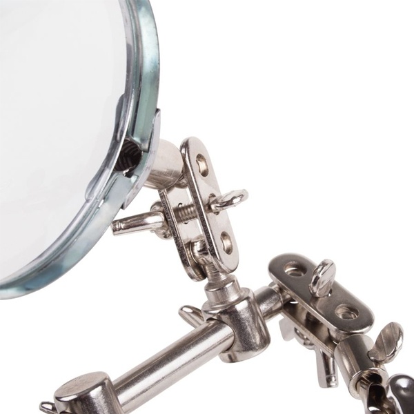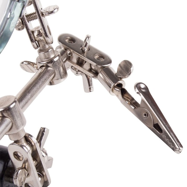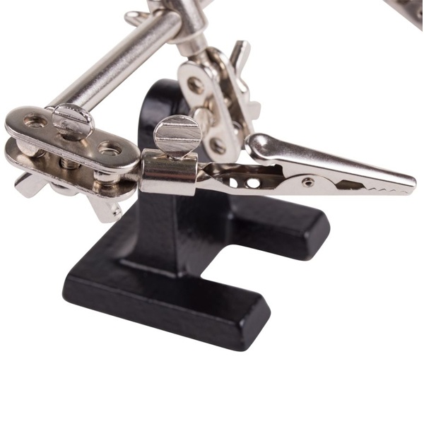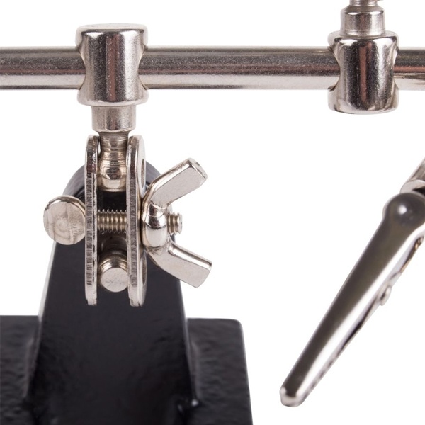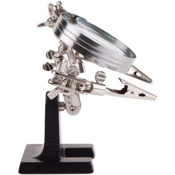 Универсальный монтажный держатель для паяльника компании Rexant оснащен лупой с 3-х кратным увеличением. Он применяется при проведении паяльно-сборочных работ в радиоэлектронном и ювелирном делах, а также при сборке и ремонте для зажима мелких деталей в любом нужном положении. Держатель состоит из тяжелого чугунного основания, 2 подвижных зажимов типа «крокодил», которые закреплены на трубке, имеют покрытие из никеля и способны фиксировать детали в различном положении. Чтобы рассмотреть даже самые мелкие детали, на держателе закреплена лупа с возможностью регулировки положения. Она изготовлена из стекла, имеет кратность увеличения в 3 раза, ее диаметр составляет 60 мм. Размер товара без упаковки в раскрытом виде составляет 268x200x55 мм. Срок службы изделия: 5 лет. Гарантия: 12 месяцев. Хранить изделие необходимо в сухом отапливаемом помещении при температуре от 0 до 45 градусов Цельсия.