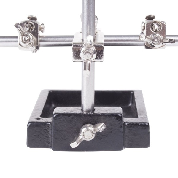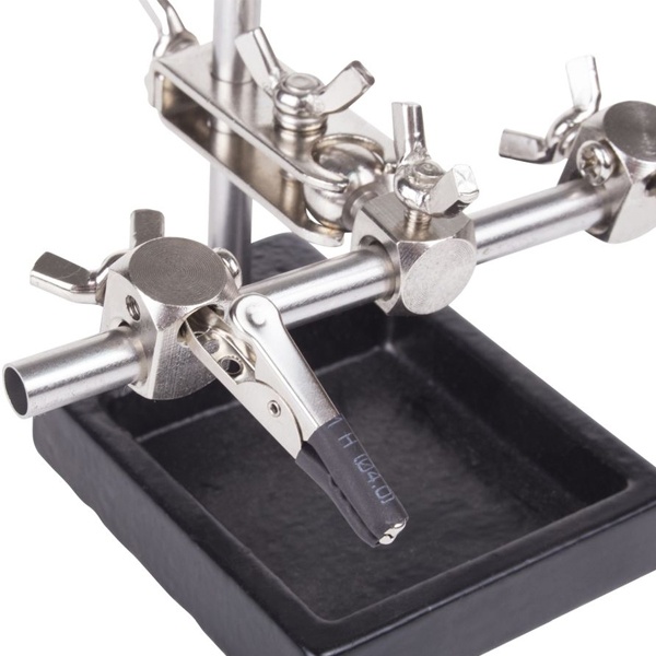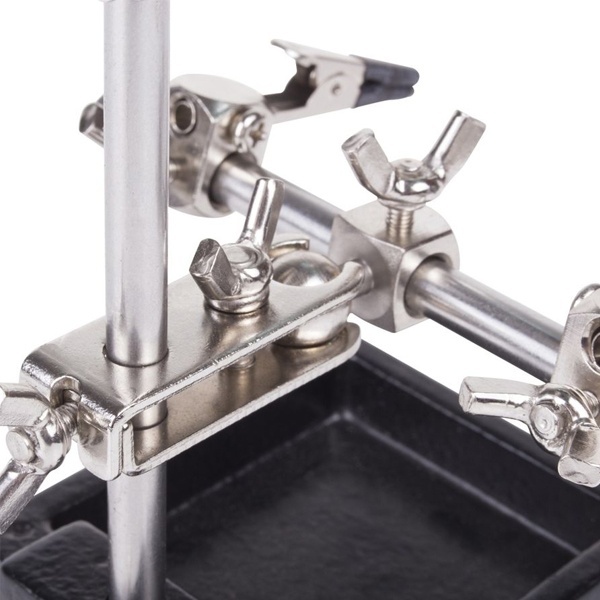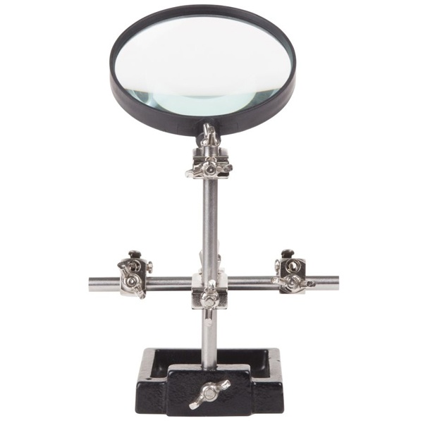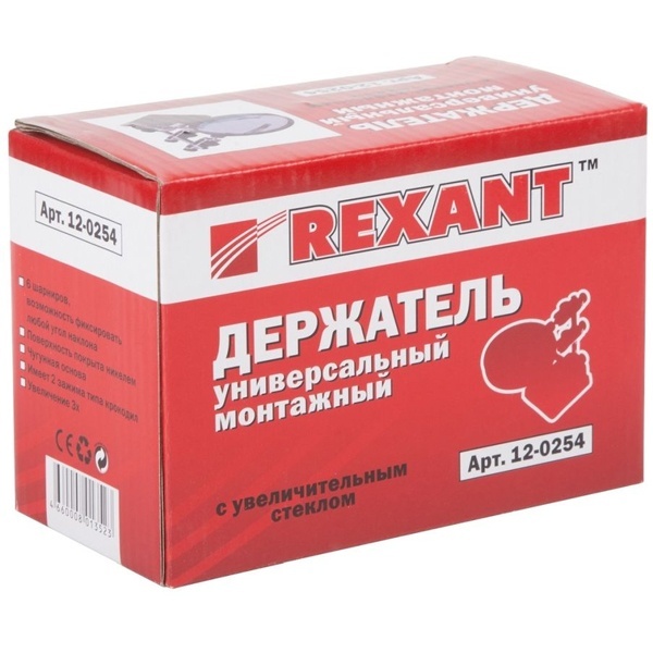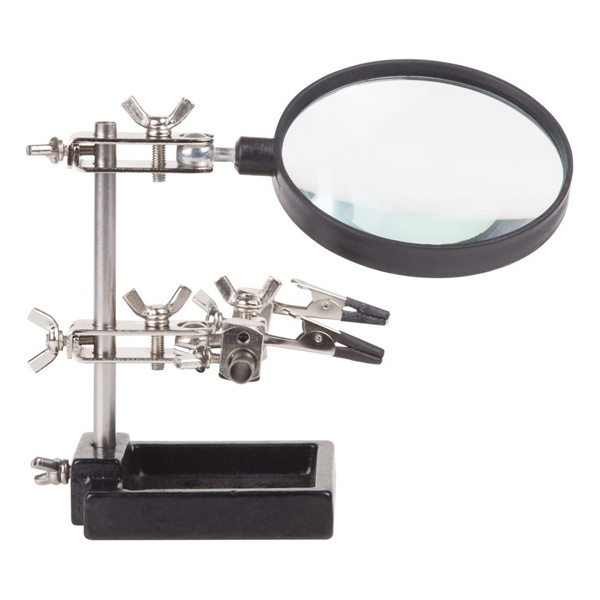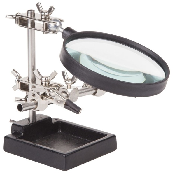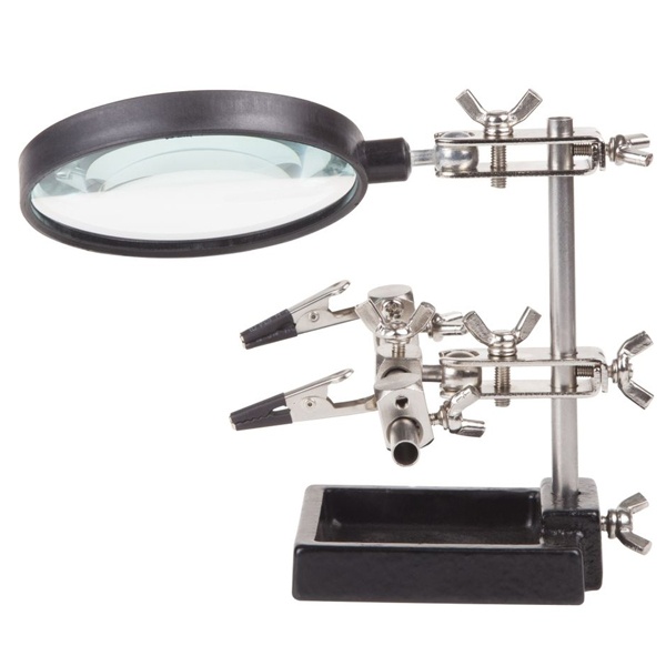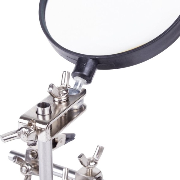 Держатель производителя Rexant «третья рука» с лупой служит для зажима в нужном положении и пайки мелких деталей, элементов микросхем, электроприборов и ювелирных украшений, когда не хватает двух рук. Данный инструмент многофункционален и предназначен для решения задач повышенной сложности. Он необходим не только специалисту для выполнения работ с высокой точностью и безопасностью, но также будет незаменим в быту. Инструмент состоит из чугунного основания в виде тяжелой подставки с нишей для мелких деталей или припоя, двух надежных подвижных зажимов типа «крокодил» с никелевым покрытием и лупы с 3-кратным увеличением. Диаметр линзы составляет 90 мм, ее можно регулировать и устанавливать в любое положение. С помощью лупы можно будет рассмотреть даже самые мелкие детали. Вес изделия – 0,725 кг.