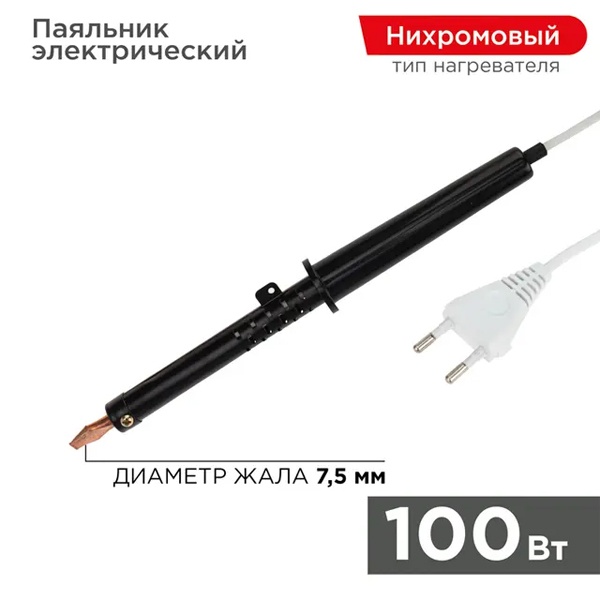 Электрический паяльник мощностью 100 Ватт, со спиральным нагревателем, с пластиковым ручкой и клинообразным жалом, Рексант 12-0291-1