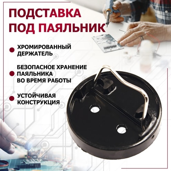 Самая компактная и мобильная подставка под паяльник бренда Rexant применяется для безопасного хранения паяльника при нагревании, в промежутках между его использованием и охлаждением. Она выполнена из хромированного держателя и термоустойчивого пластмассового основания. Легкая и бюджетная подставка под паяльник обеспечит безопасную работу мастера и защитит рабочую поверхность инструмента. Хранить изделие необходимо в сухом отапливаемом помещении при температуре от 0 до 45 градусов Цельсия.