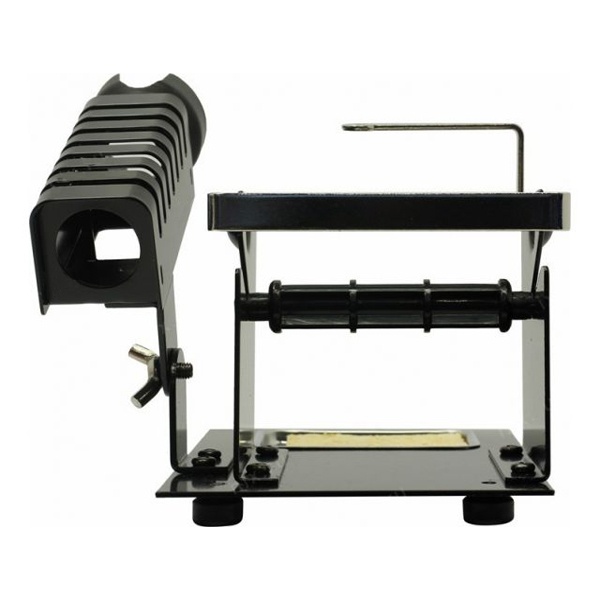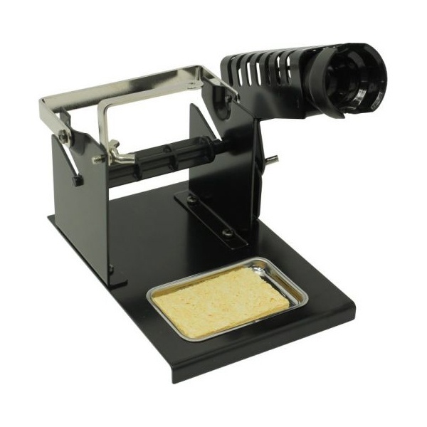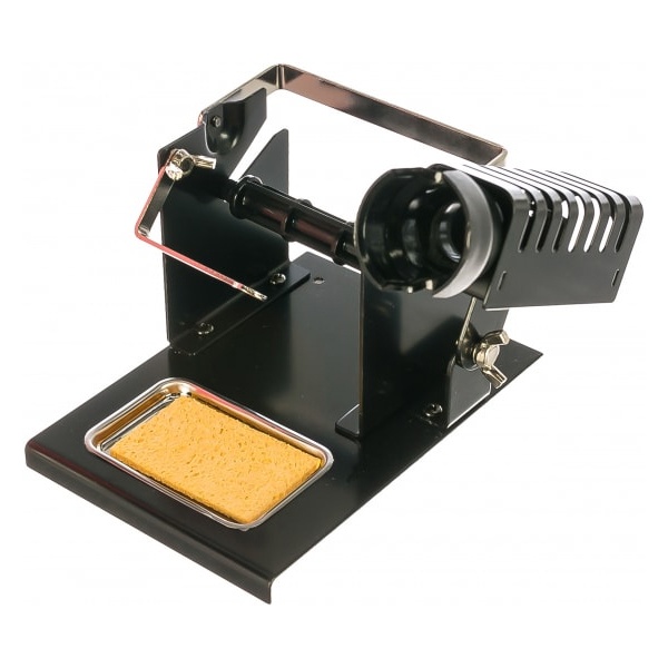 Удобная металлическая подставка для паяльника фирмы Rexant с регулируемым наклоном держателя предназначена для безопасного хранения паяльника при нагревании, в промежутках между использованием и охлаждением. Подставка имеет держатель для припоя на катушке. Платформа подставки имеет ложемент под губку для очистки жала паяльника от остатков припоя. Паяльник легко и удобно помещается в направляющую. Вес изделия составляет 0,5 кг.