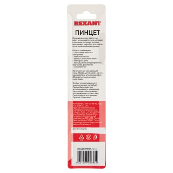 Пинцет прямой 140 мм REXANT предназначен для манипуляции маленькими предметами, которые невозможно, неудобно, либо нежелательно или опасно брать незащищенными руками.