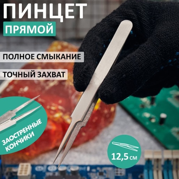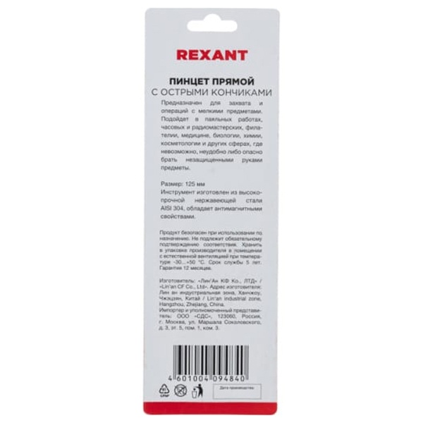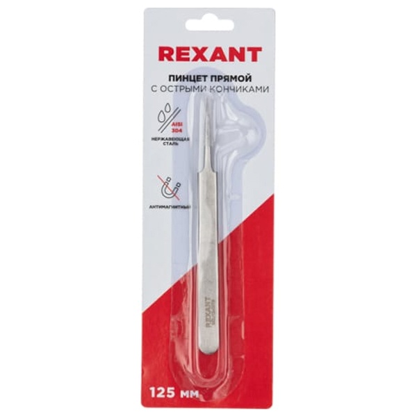 Пинцет прямой с острыми кончиками 125 мм (блистер) REXANT