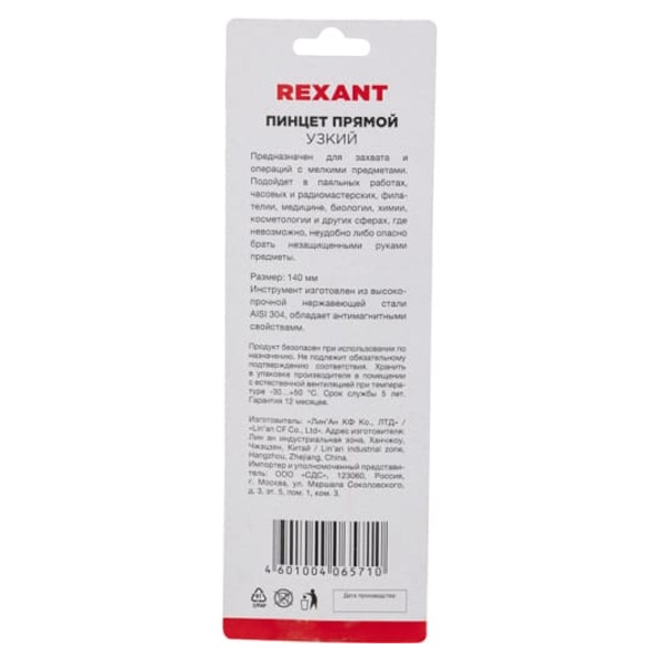 Пинцет прямой узкий 140 мм Airy (блистер) REXANT