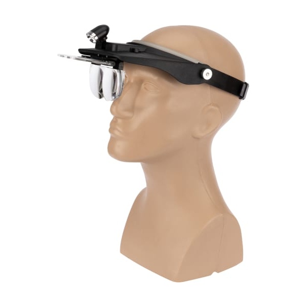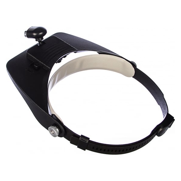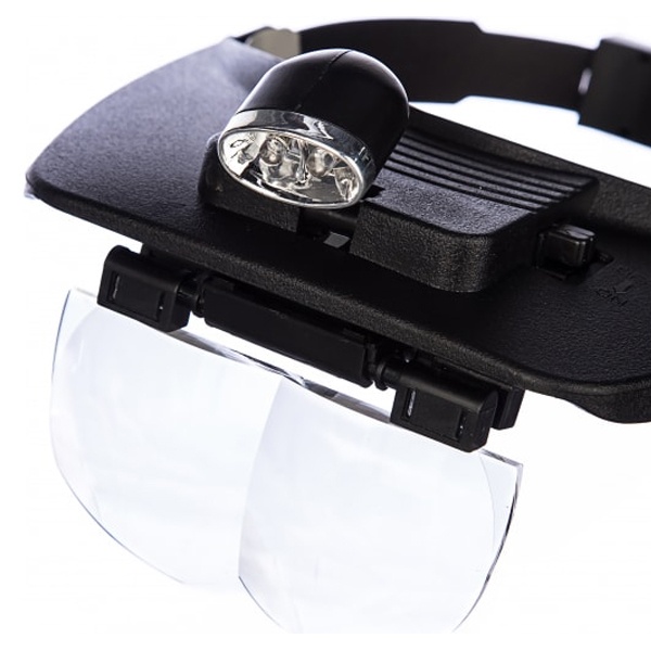 Налобная бинокулярная лупа, увеличение: x1,8; x2,3; x3,5 Легкие пластиковые линзы, подсветка.