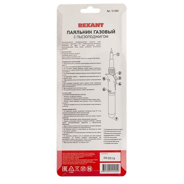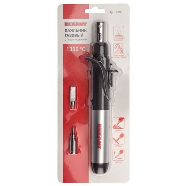 Паяльник газовый REXANT предназначен для ручного монтажа радиоэлементов, для плавки и сварки пластиковых частей, нагрева малых металлических элементов, плавки металла с низкой температурой плавления, ремонта ювелирных изделий, сгибания тонких стеклянных трубок, прогрева механизмов в холодное время года и т.п.
