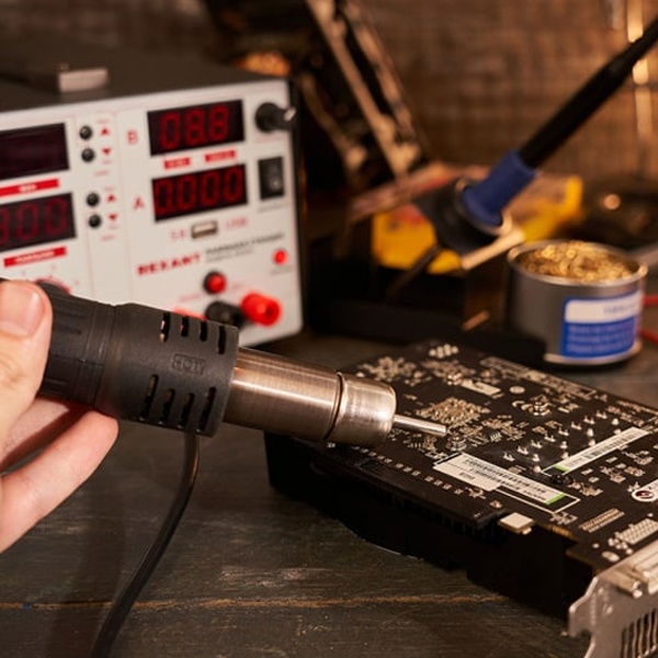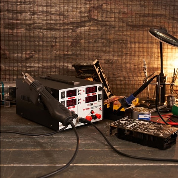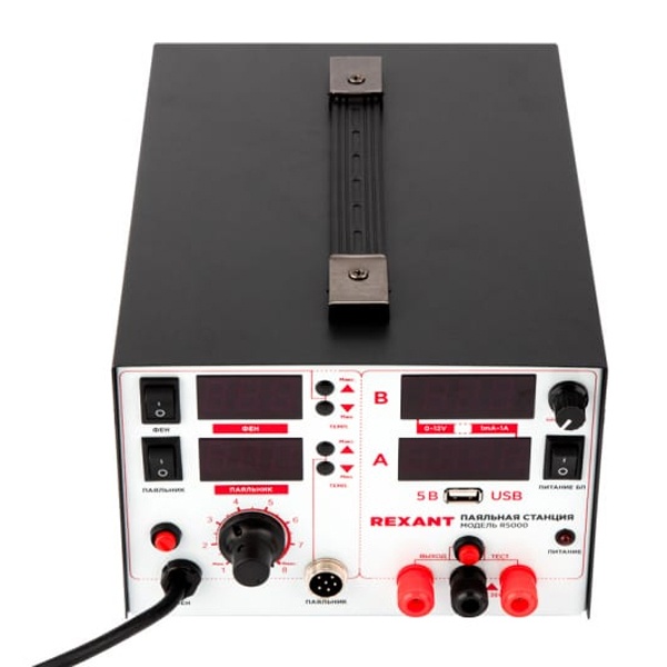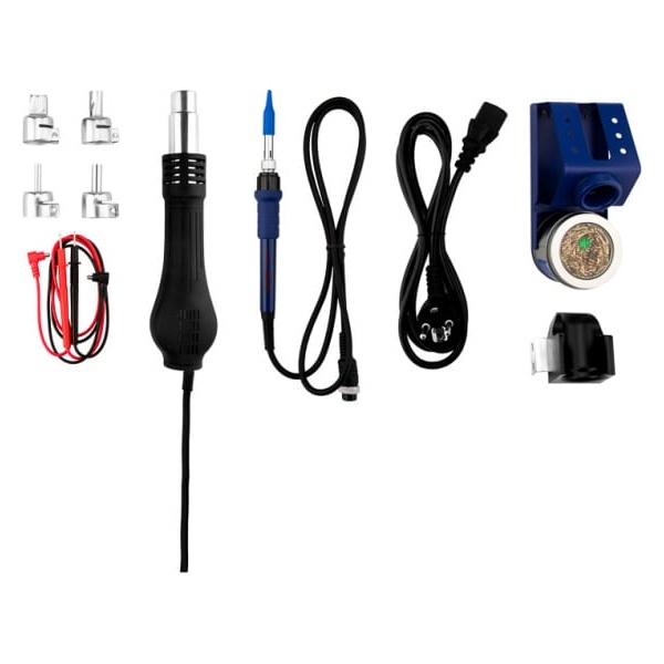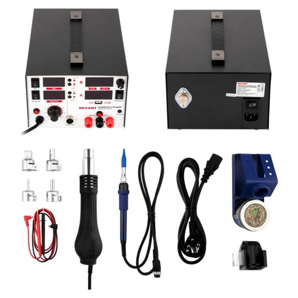 Уникальная многофункциональная паяльная станция 3 в 1 оснащена термофеном, паяльником и источником питания. Все три функции автономны и могут работать независимо друг от друга.Дополнительная опция USB разъем обеспечивает соединение станции с другим оборудованием.Паяльная станция применяется для демонтажа или пайки различных видов электронных компонентов. В основном используется для ремонта портативной электроники (мобильные телефоны, видеокамеры и пр.), бытовой техники, а также для сборочных операций в небольшом производстве.Микрокомпьютер для цифрового отображения данных и контроля температуры с точностью до 1 °C, большая мощность, быстрый разогрев. Все эти преимущества делают бессвинцовую распайку или пайку безопасной для таких чувствительных компонентов как SOIC, PLCC, QFP, BGA и т. д.