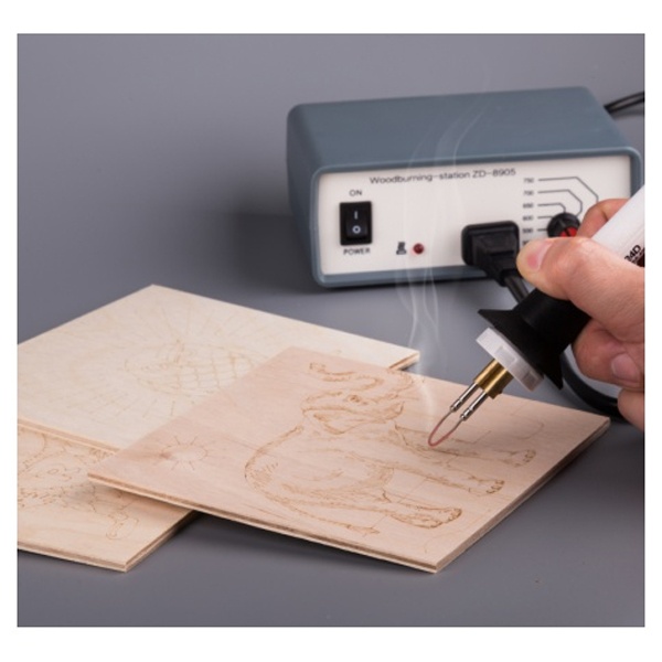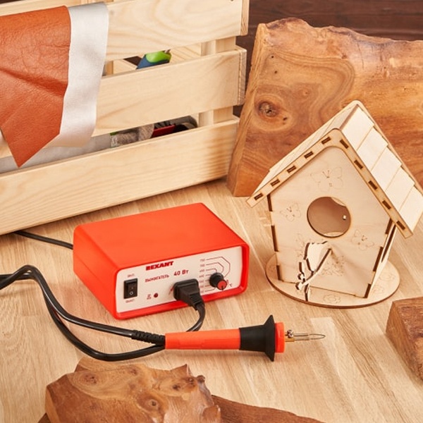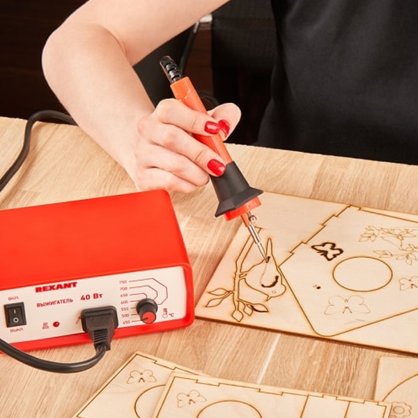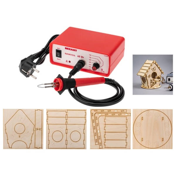 Прибор для выжигания по дереву предназначен для выжигания рисунков или орнамента на дреевянных поверхностях или коже. Удобная эргономичная рукоятка выполнена из термостойкого пластика и имеет кольцо, которое убережет паяльное жало от соприкосновения с другими предметами, в том числе исключая случайные ожоги. В комплекте к прибору поставляются доски для выжигания изготовленные из качественной шлифованной фанеры. На доски нанесены разные рисунки с разным уровнем сложности. В процессе работы у детей развивается мелкая моторика пальцев, внимательность, усидчивость и аккуратность. У ребенка формируются навыки рисования и фантазия, основы работы с выжигателем. Дополнительно оформить резуьтат работы можно акварельными и гуашевыми красками, цветными карандашами и фломастерами.