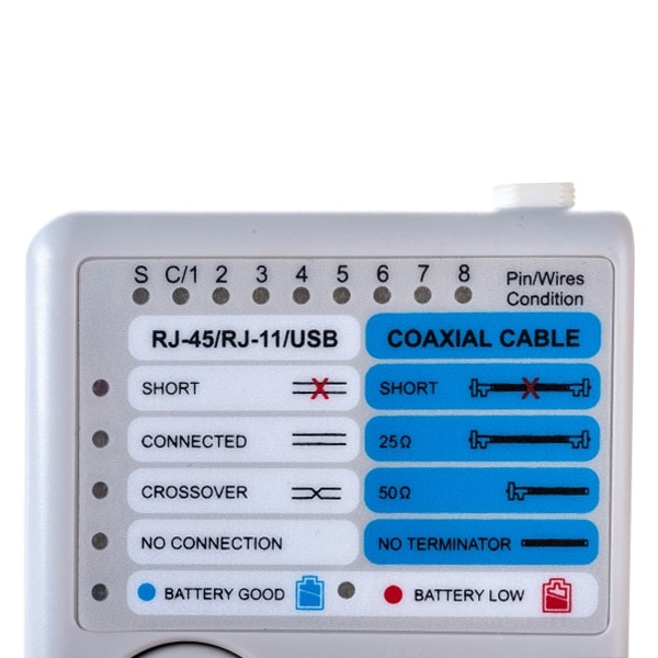 Тестер Кабеля "универсальный" RJ-45 + RJ-11 + RJ-12 + USB + BNC HT-2468B REXANT применяется для тестирования витой пары, телефонного, USB и коаксиального кабеля. Тестер состоит из двух функциональных блоков - из активной и пассивной части (заглушки), которые подключаются к концам кабельной линии через разъемы RJ-45, RJ-12, USB и BNC. Прибор имеет встроенный BNC терминатор 25/50 Ом. Результаты теста выводятся на информативную LED панель, на которой также есть индикация зарядки батареи питания. Максимальная длина тестируемого кабеля 100 метров. Напряжение питания 9 Вольт от батареи типа "Крона". Корпус, размером 144х86х25.5 мм, изготовлен из ударопрочной пластмассы и имеет красивый практичный дизайн.