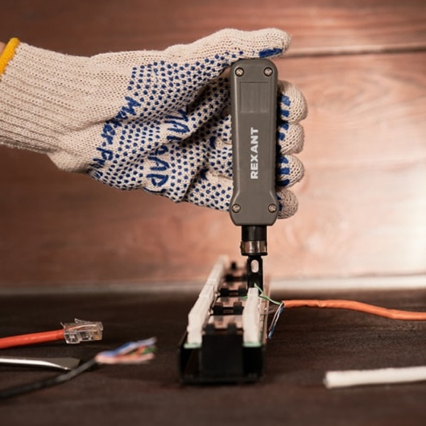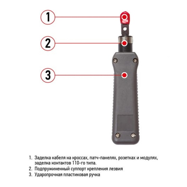 Инструмент для заделки витой пары 110 HT-3240 (TL-324B) (HT-324B) REXANT предназначен для заделки кабеля на кроссах, патч-панелях, розетках и модулях, заделка контактов 110-го типа. Инструмент выполнен из качественной инструментальной стали, есть возможность быстрой замены ножа (в комплекте двухсторонний с отрезкой). Заделка имеет подпружиненный суппорт крепления лезвия. Удобная пластиковая рукоятка сделает эксплуатацию инструмента более комфортной и убережет от соскальзывания из рук.