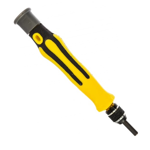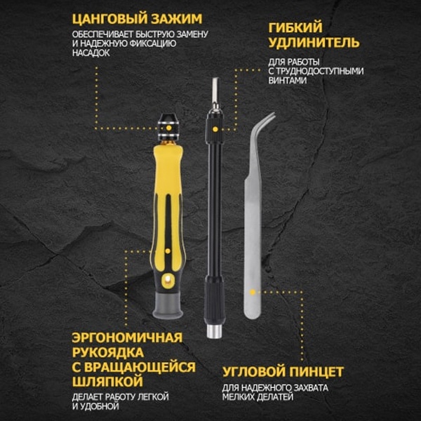Набор отверток для точечных работ 45 предметов REXANT предназначен для выполнения прецизионных работ в электронике и электромеханике. Прекрасно подойдет для ремонта мобильных телефонов, планшетов, электронных книг, часов, ноутбуков и другой техники. Биты набора выполнены из хромованадиевой стали. Эргономичная двухкомпонентная рукоятка отвертки делает работу синструментом легкой и удобной. Цанговый зажим обеспечивает быструю замену и надежную фиксацию насадок.