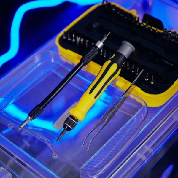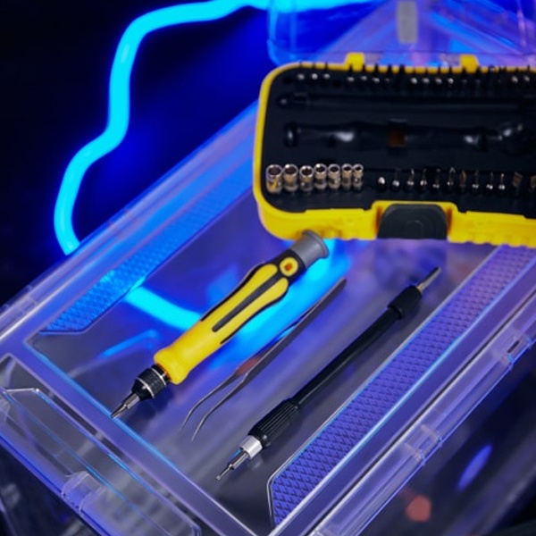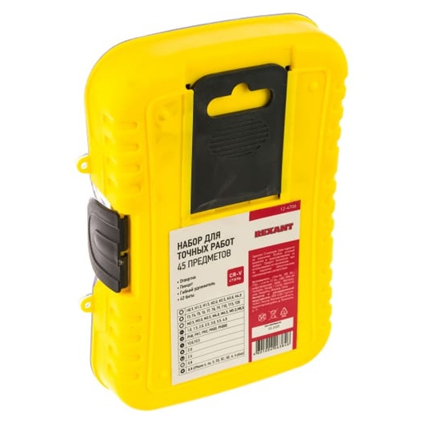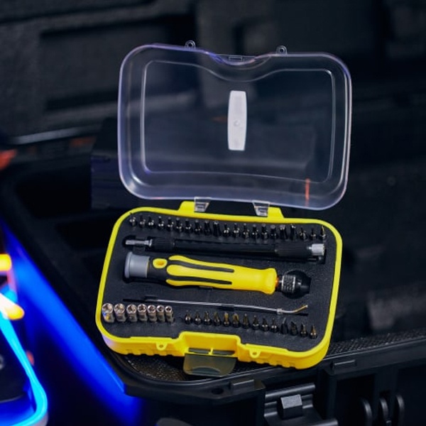 Набор поставляется в пластиковом боксе и содержит 45 предметов:- Отвертка