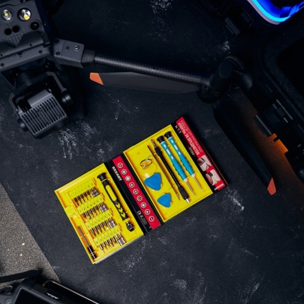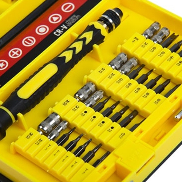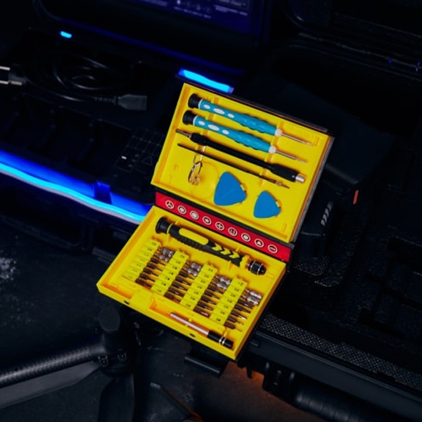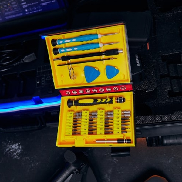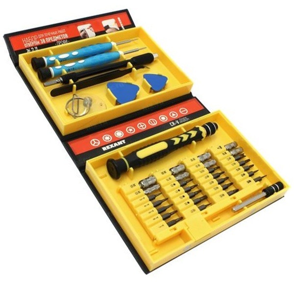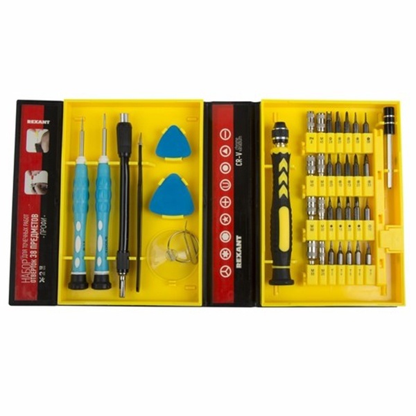 Набор поставляется в пластиковом прорезиненном футляре и содержит 38 предметов:- 2 отвертки специального назначения: iPhone, Android;