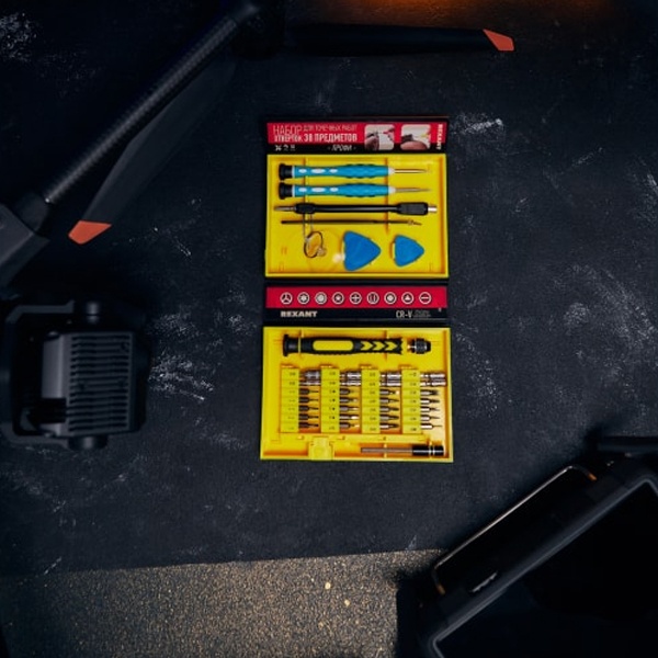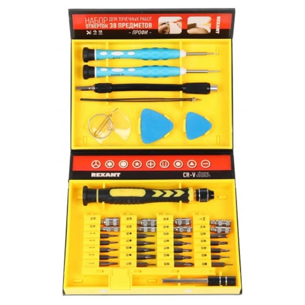 Набор для точечных работ 38 предметов Профи REXANT предназначен для выполнения прецизионных работ в электронике и электромеханике. Прекрасно подойдет для ремонта мобильных телефонов, планшетов, электронных книг, часов, ноутбуков, MacBook, iPhone и др. Биты набора выполнены из хромованадиевой стали. Эргономичная двухкомпонентная рукоятка отвертки делает работу с инструментом легкой и удобной. Цанговый зажим обеспечивает быструю замену и надежную фиксацию насадок.