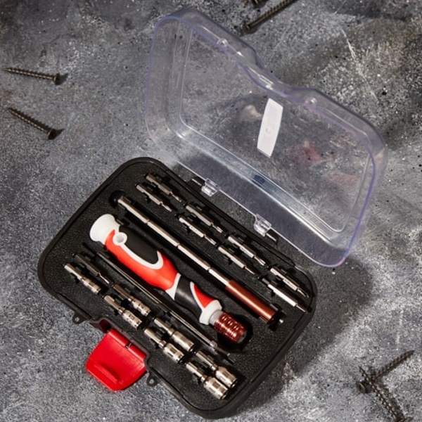 Набор поставляется в пластиковом боксе и содержит 19 предметов:- Отвертка