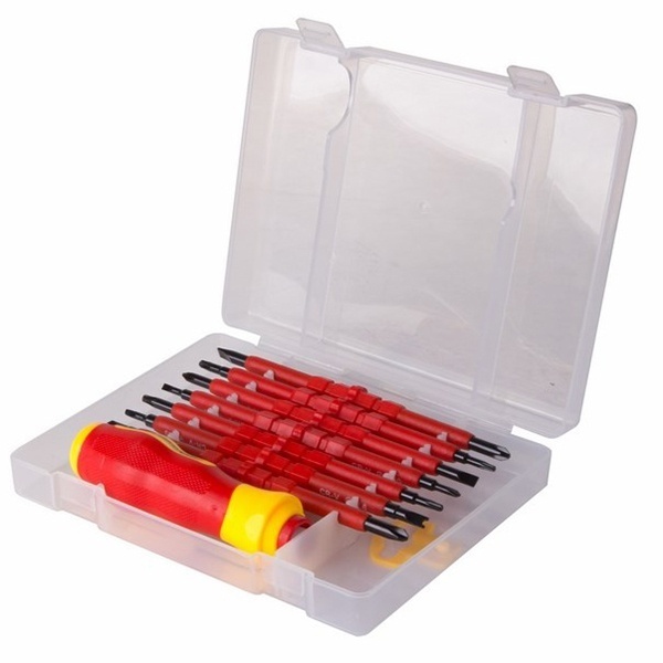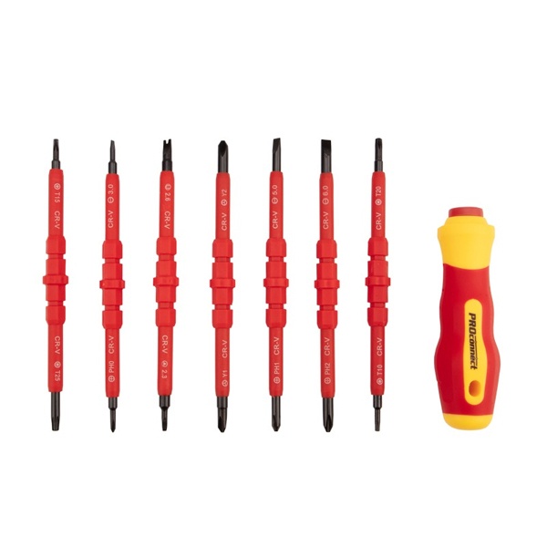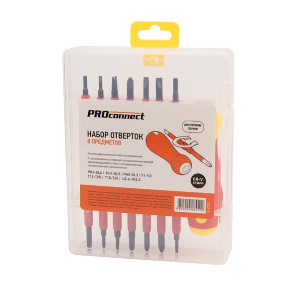 Набор отверток из 8 предметов для электромонтажных работ, монтажа/демонтажа крепежных соединений. Двухсторонние стержни отвертки из высококачественной хромованадиевой стали с оксидированным намагниченным наконечником, покрыты специальным изоляционным материалом. Эргономичная изолированная двухкомпонентная рукоятка делает работу с инструментом легкой и удобной. Набор поставляется в пластиковом боксе.