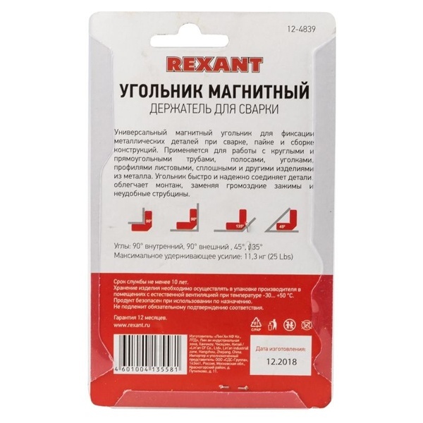 Магнитный угольник-держатель для сварки на 4 угла, усилие 11,3 кг REXANT, предназначен для фиксации металлических деталей при сварке, пайке и сборке конструкций. Применяется для работы с круглыми и прямоугольными трубами, полосами, уголками, профилями, листовым, сплошным и другими видами металла.Угольник быстро и надежно соединяет детали, сокращает время работы, облегчает монтаж и заменяет громоздкие зажимы и неудобные струбцины.