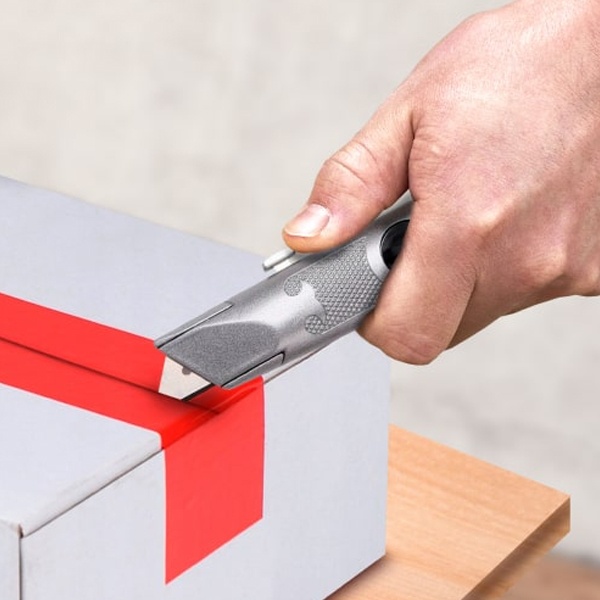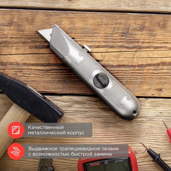 Нож с выдвижным трапециевидным лезвием REXANT — отличный помощник для резки различных материалов: пластика, линолеума, кровельных материалов, гипсокартонных и гипсолитовых плит, бумаги, картона. Корпус ножа выполнен из металла, что позволяет прикладывать значительное усилие при резке и обеспечивает долгий срок службы. Лезвие изготовлено из высококачественной инструментальной стали. Замена лезвия осуществляется вручную.