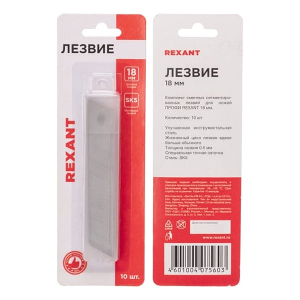 Комплект сменных сегментированных лезвий для ножей Рексант шириной 18 мм, в блистере 12-4912-1